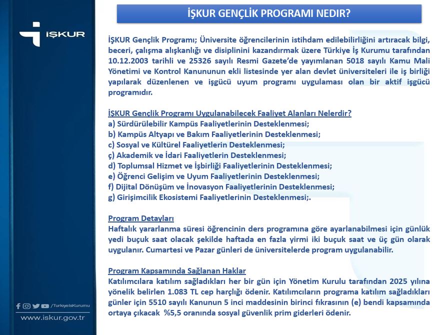 Bu kapsamda Üniversitemizde 11-15 Şubat 2025 tarihleri arasında İŞKUR Gençlik Programı başvuruları alınacaktır. Sonuçlar ise 19 Şubat 2025 Çarşamba günü noter huzurunda yapılacak olan kura ile belirlenecektir.