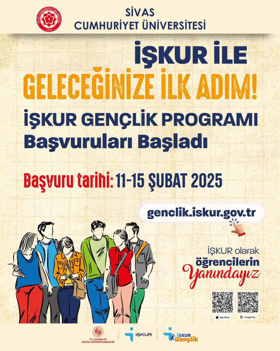 Üniversitemiz ve İŞKUR Sivas İl Müdürlüğü işbirliğinde Kariyer Planlama Uygulama ve Araştırma Merkezi koordinesinde İŞKUR Gençlik Programı düzenlenecektir. İŞKUR Gençlik Programı, gençlerin mesleki deneyim kazanmalarını, iş hayatına adım atmalarını ve geçici gelir desteğiyle ekonomik olarak desteklenmelerini sağlamayı amaçlamaktadır.