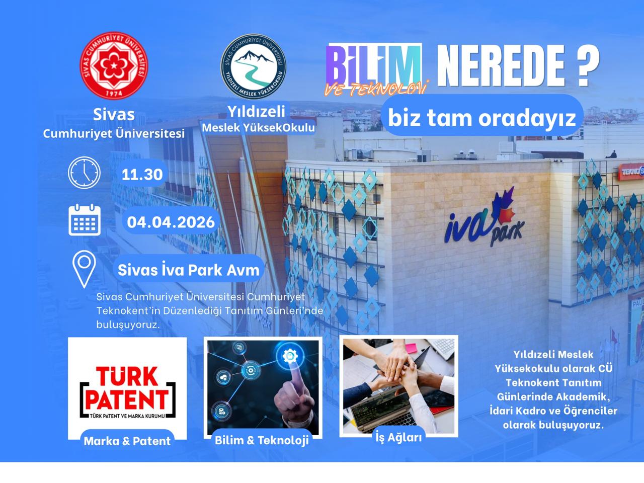 Sivas Cumhuriyet Üniversitesi Cumhuriyet Teknokent tarafından düzenlenecek olan Tanıtım Günleri kapsamında, Yıldızeli Meslek Yüksekokulu olarak akademik ve idari personelimiz ile öğrencilerimizle birlikte etkinlikte yer alacağız.